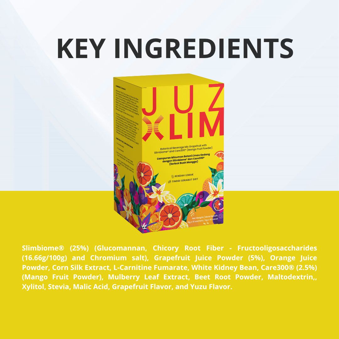 Slimbiome® (25%) (Glucomannan, Chicory Root Fiber - Fructooligosaccharides (16.66g/100g) and Chromium salt), Grapefruit Juice Powder (5%), Orange Juice Powder, Corn Silk Extract, L-Carnitine Fumarate, White Kidney Bean, Care300® (2.5%) (Mango Fruit Powder), Mulberry Leaf Extract, Beet Root Powder, Maltodextrin,, Xylitol, Stevia, Malic Acid, Grapefruit Flavor, and Yuzu Flavor.