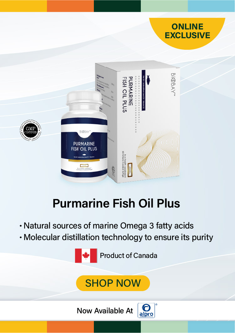Biobay Purmarine Fish Oil Plus is formulated with concentrated Omega 3 fatty acids, contains EPA (eicosapentaenoic acid) 600mg and DHA (docosahexaenoic acid) 300mg. It is added with Sea Buckthorn Seed Oil and Vitamin D3 to provide optimum health benefits.